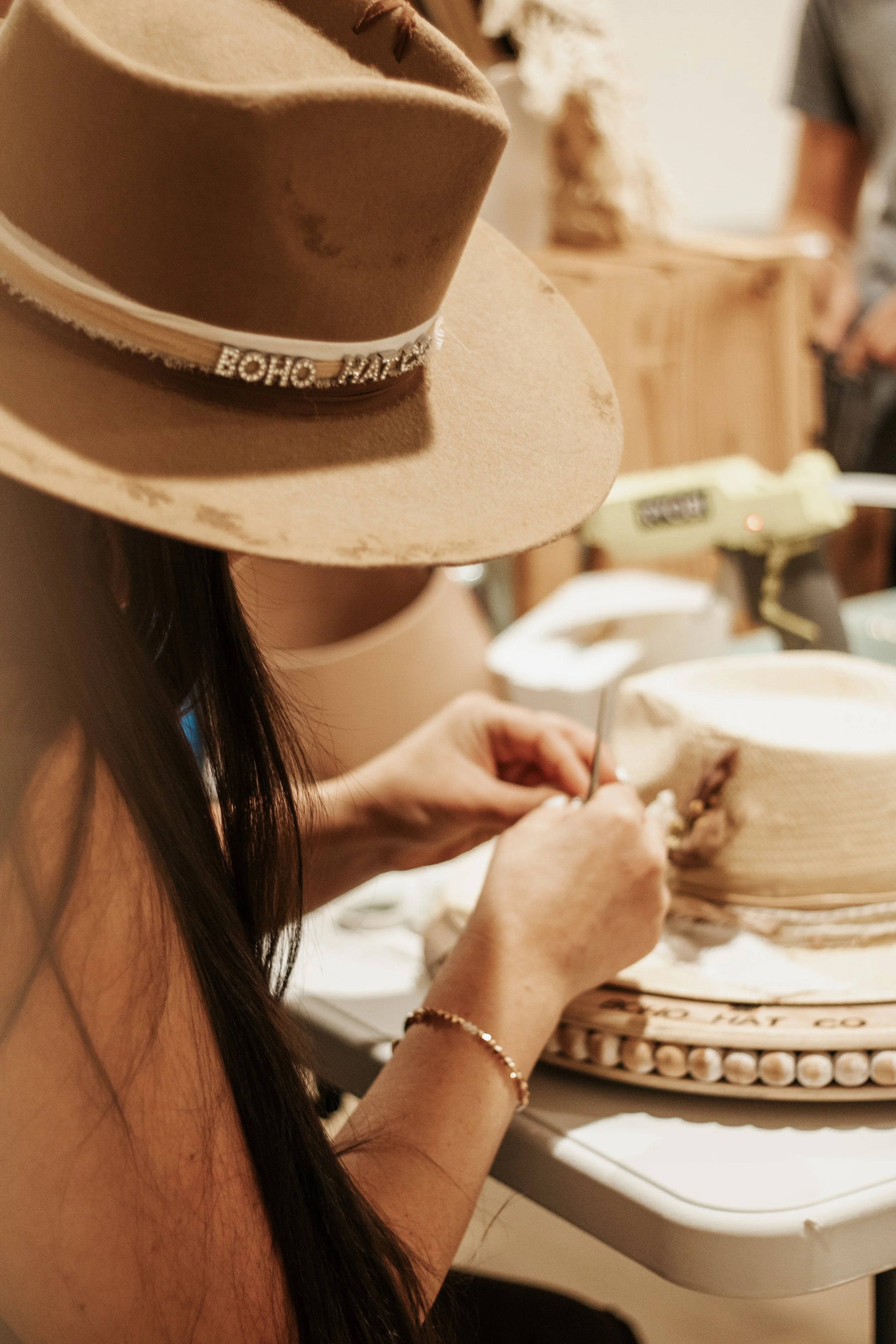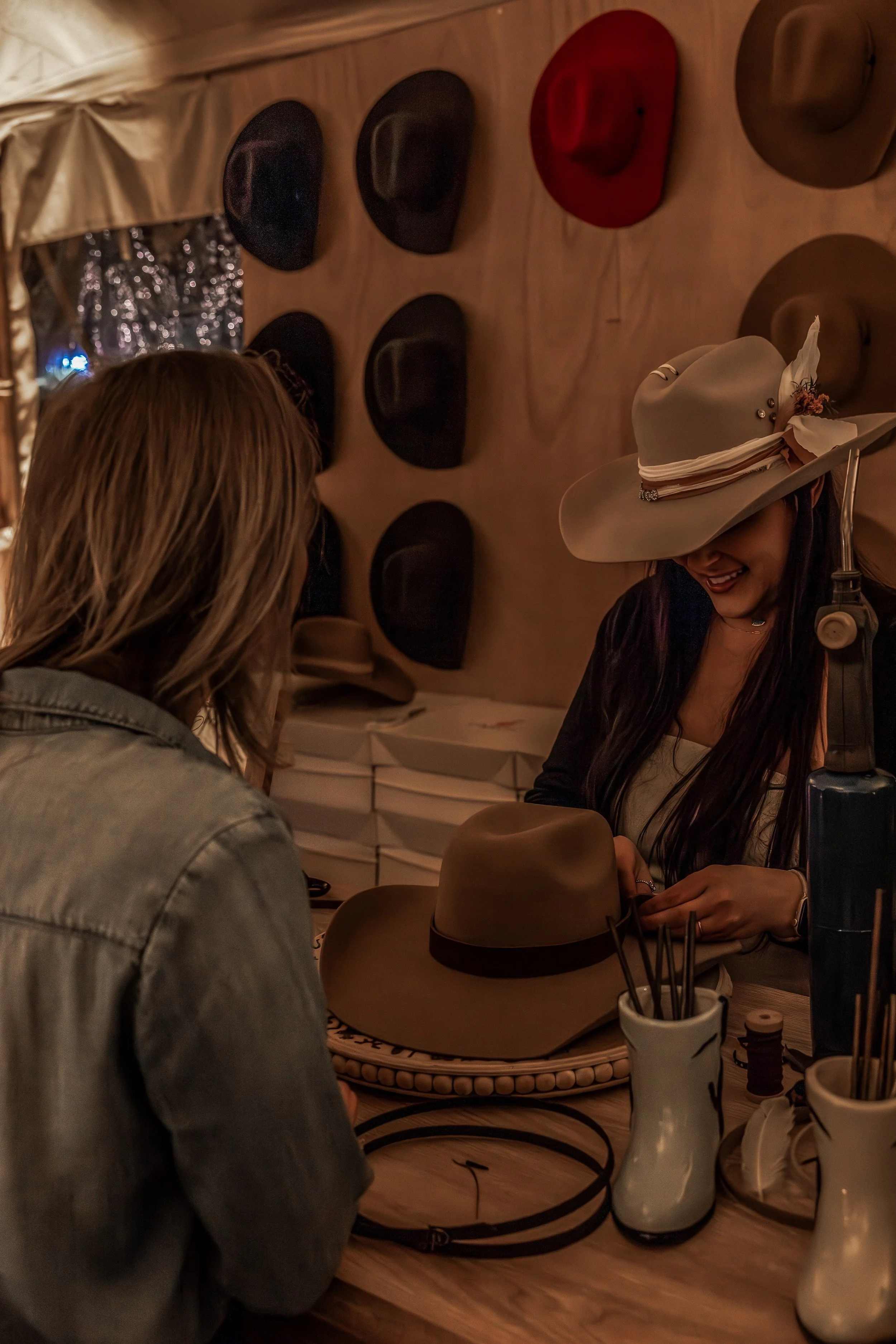 Hat BarOur hat bar offers an array of different hat shapes, materials, and accessories to choose from. We can set up at your event with a-la-carte pricing where the guests pay individually, or if treating your guests, we offer all-inclusive pricing packages. Our hat bar setup includes our rancher/cowboy hats, as well as our brand new upscale trucker hats and patches!